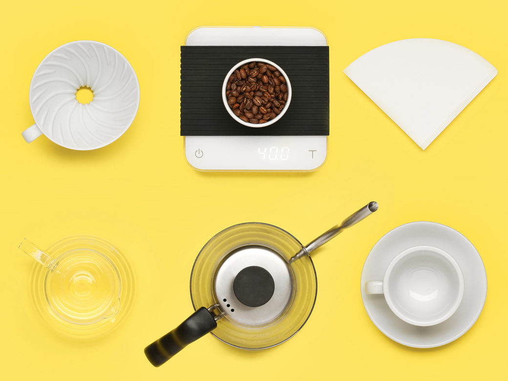 Grind the coffee and place it into the filter. We like making a depression in the bed of the coffee with a spoon or your finger to focus the stream of water to saturate all of the coffee. Place your coffee on the scale and tare it. Get your stopwatch ready!